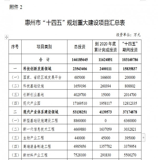 6月3日,惠州市政府正式對外公布《惠州市國民經(jīng)濟(jì)和社會發(fā)展第十四個五年規(guī)劃和2035年遠(yuǎn)景目標(biāo)綱要》(下稱《綱要》)。其中明確提出,“十四五”期間規(guī)劃建設(shè)重大項(xiàng)目312宗,計(jì)劃總投資近1.5萬億元,“十四五”期間計(jì)劃投資10316億元。