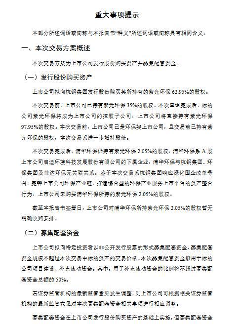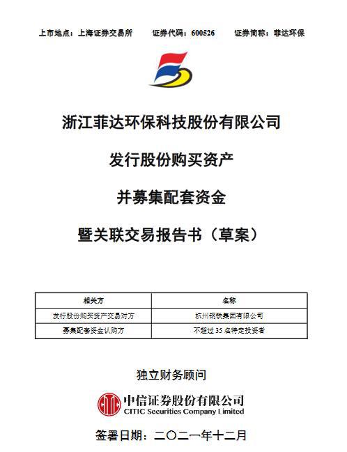 12月16日菲達環保公布發行股份購買資產并募集配套資金暨關聯交易報告書(草案),上市公司擬向公司控股股東杭鋼集團發行股份購買其所持有的紫光環保62.95%的股權。